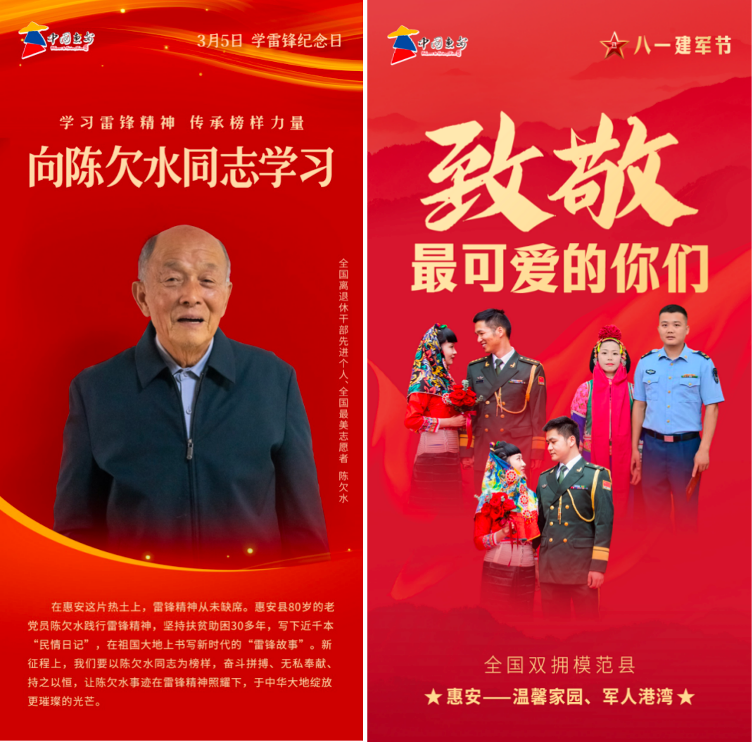 传统的政策宣传往往较为枯燥,《看见惠安》选择用“视觉化”让政策宣传变得生动。以“高瞻远‘筑’”写惠安建筑业政策,以“举‘石’闻名”写惠安石雕产业政策,巧妙的文案和设计瞬间让产业政策变成生动易懂;在学雷锋纪念日,推出“向陈欠水同志学习”主题海报,号召基层向身边榜样陈欠水同志学习,让榜样力量直抵人心。在八一建军节推出“致敬最可爱的你们”主题海报,展示“全国双拥模范县”惠安“军装配惠女”的美好画面,展现军地携手,在“双拥路”上的双向奔赴。