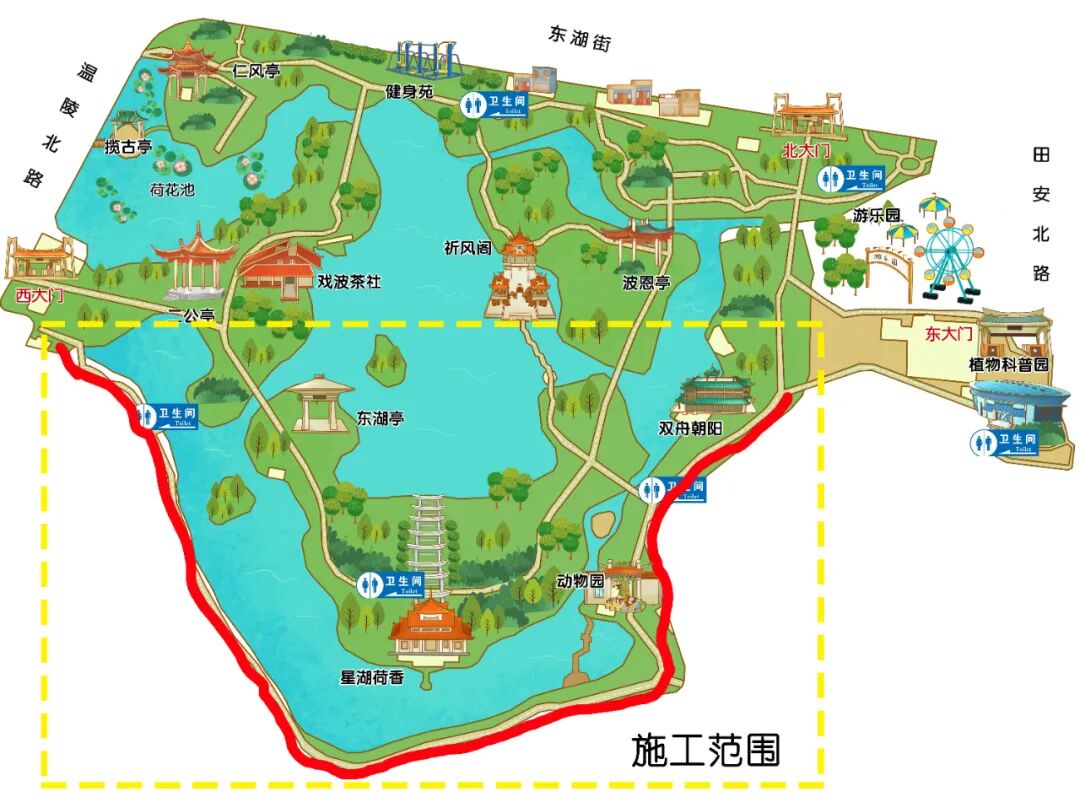 施工范围从东湖公园南面围墙出发,途经动物园、东大门,最终接入市政污水管网,总改造管网长度约400米。主要施工内容包括清淤、对现有污水管道进行修复,解决管道老化、堵塞问题;采用明开挖方式推进部分管道施工,保障管网连接通畅;公园东南角闲置绿地新建一座小型一体化污水泵站,占地面积为10米×8米,强化区域污水输送能力;施工完成后同步开展路面平整与景观恢复工作。