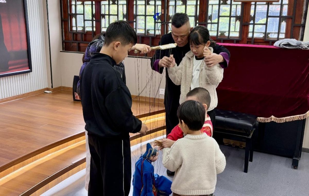 体验环节中,在非遗代表性传承人的指导下,家长与孩子们轮番上阵,亲手体验提线木偶操控技艺。看似简单的抬手、转身动作,实则需要手脚眼的协调配合,大家相互协作、反复尝试,在实践中感受“丝线牵动千古情”的趣味与智慧。