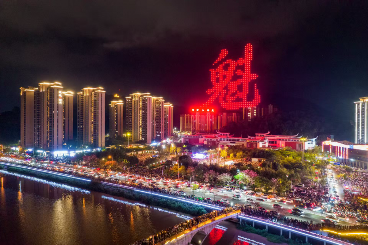 短短几分钟内,天空中先后浮现出永春白鹤拳、魁星文化、有一种生活叫永春等系列永春标志性元素,每一次图案变换都引来现场阵阵惊叹,将氛围推向一个又一个高潮。