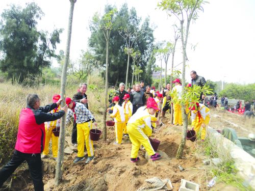 记者在活动现场看到,植树现场一片繁忙,不管是莲埭小学的小学生志愿服务队队员,还是莲西村老年志愿者,都干得热火朝天,他们忙着搬运树苗,挖树坑,扶植树苗,给树坑培土、洒水等。当天,由莲西村两委、莲西村老年协会、莲西村关工委、莲西村老年志愿者及莲埭小学志愿服务队、莲埭小学校董会等组成的义务植树志愿者队伍,经过一上午的辛苦劳动,140多株大小不一的盆架子树在莲西村关公头山坡形成了长长的“绿化带”,为莲西村增添新绿,助力莲西村村容环境改善。(记者兰良增)