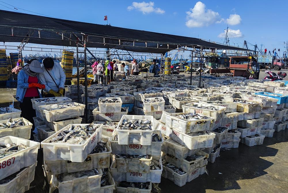 图为昨日下午,渔民在祥芝国家中心渔港清点渔获