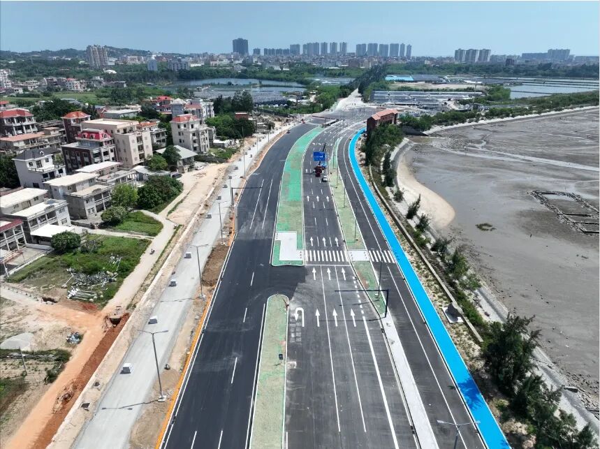 崭新的沥青路面、白色的交通标线,沿海一侧则延续整条沿海大通道风格,设置蓝色的人行漫道——航拍下的这段滨海景观廊道,小清新新貌已经清晰可见。