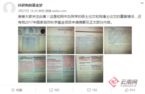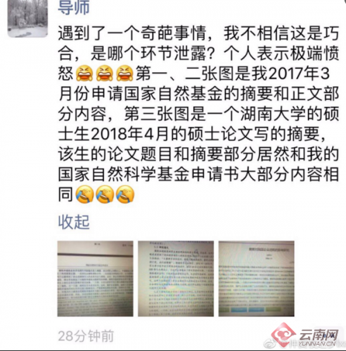 3月27日,云南财经大学一名副教授、研究生导师在微博上发帖称,2017年3月,她以“腐败对企业逃税的影响效应研究”为题,申请了国家自然科学基金项目,当年这个项目没中。这名老师表示,由于这个项目同时也是自己博士论文的选题,球探体育比分:3月21日,当其完成博士论文写作,在论文查重过程中,发现自己辛辛苦苦所写的博士论文与湖南大学刘梦洁同学完成于篮球比分直播:4月的硕士论文“腐败对企业逃税的影响研究”累计重复了15626字。“经过我仔细对比,刘梦洁同学的硕士论文剽窃的正是我2017年国家自然科学基金申请书。”
