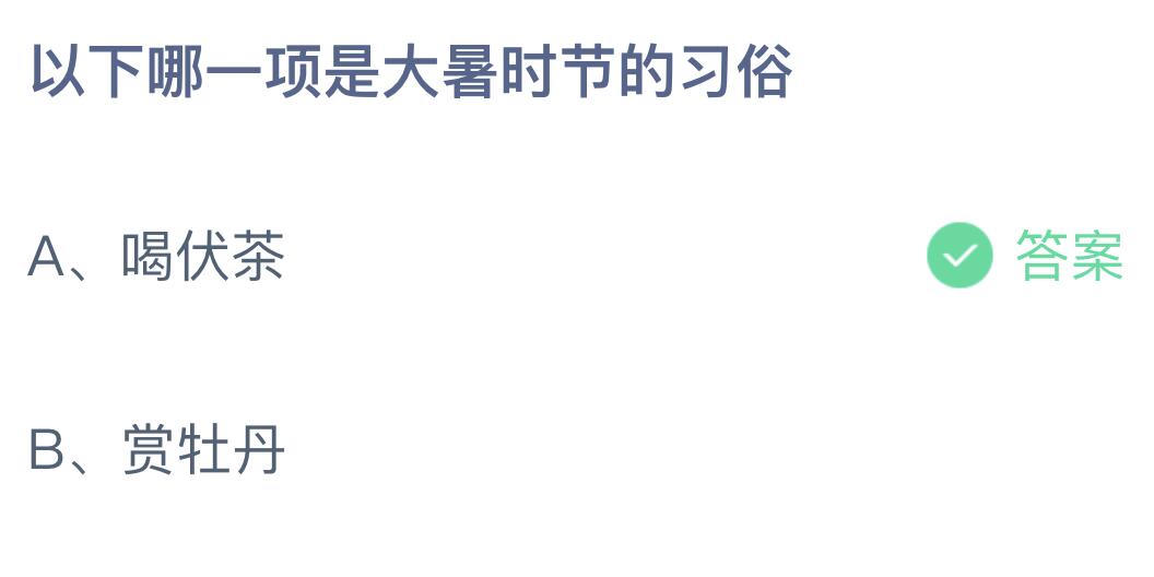 以下哪一项是大暑时节的习俗?这是支付宝蚂蚁庄园7月23日的问题,在今日已提前公布,答对即可获得一份180g小鸡宝宝饲料作为奖励。那么接下来就让我们一起了解一下正确答案吧。