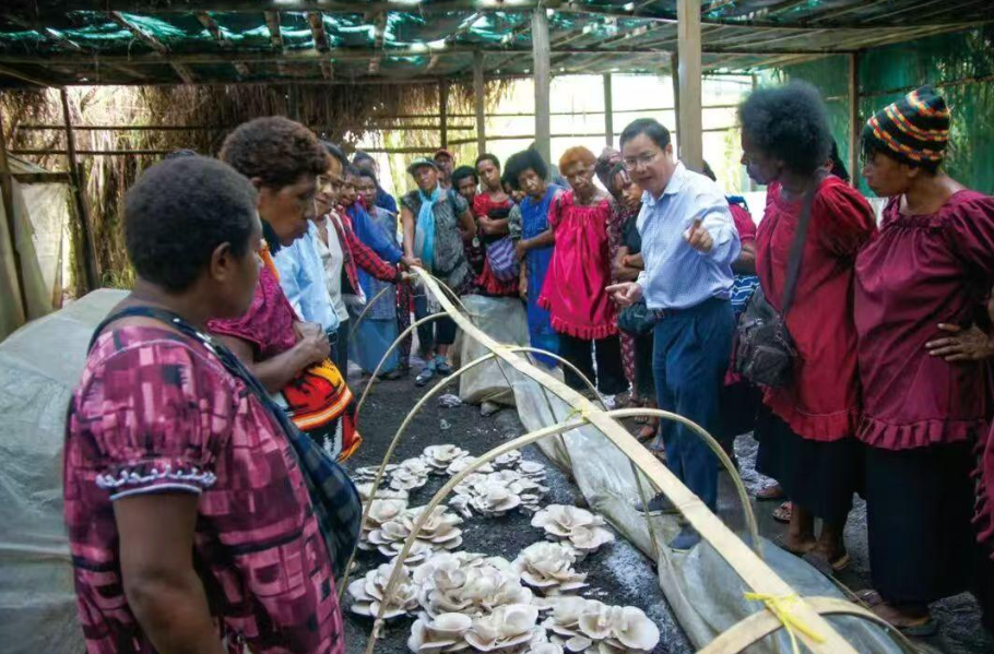 球探体育比分:12月19日,福建农林大学专家向巴布亚新几内亚东高地省当地居民介绍菌草。图源:南南合作网