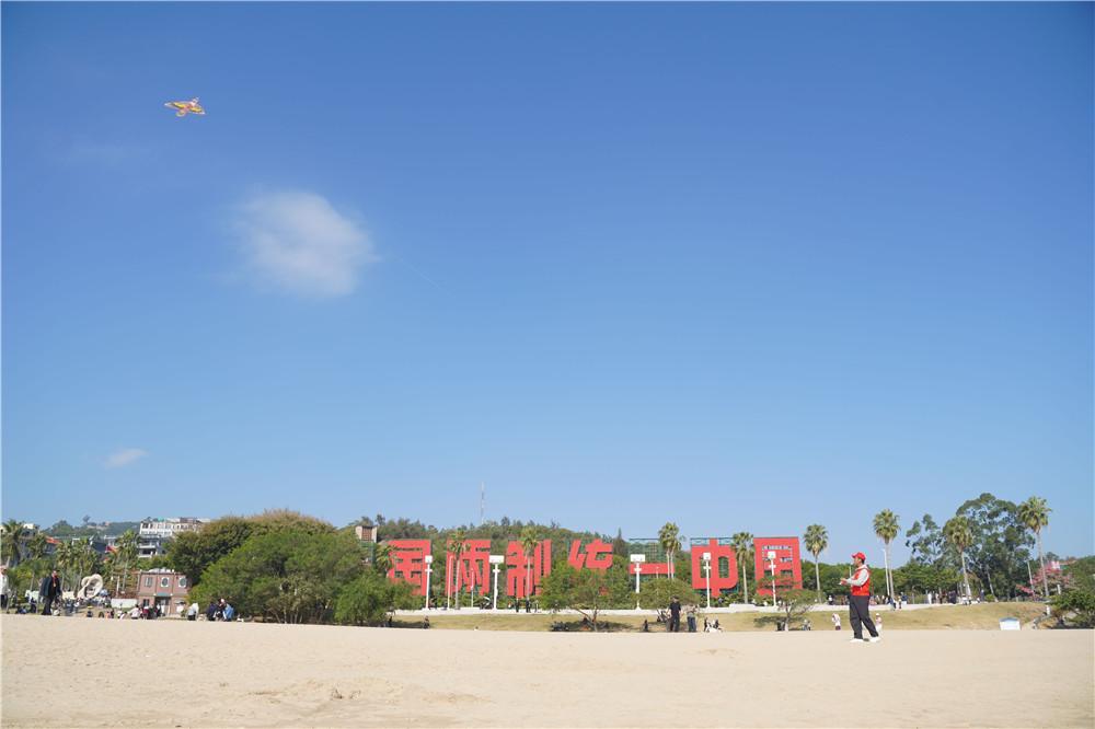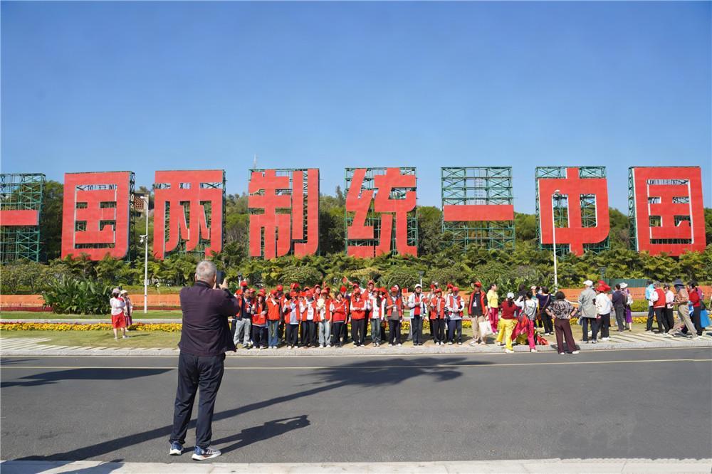 在“一国两制”沙滩上,研学团挥舞着鲜艳的五星红旗合影。他们不仅是旅途的记录者,也成了这片海滨最亮眼的风景。