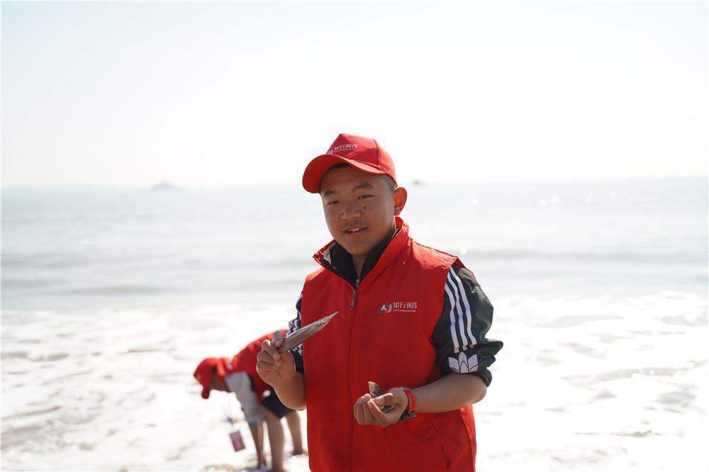 小记者欣喜地展示着在海边发现的贝壳。