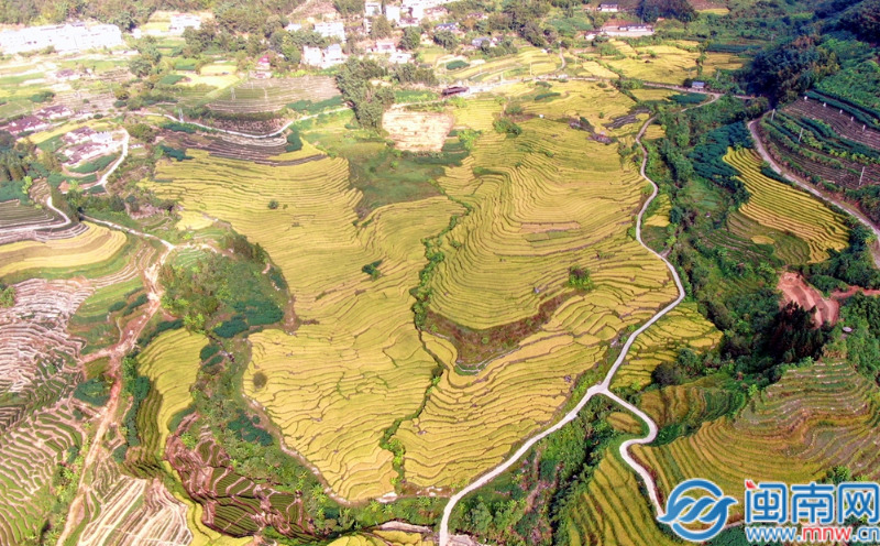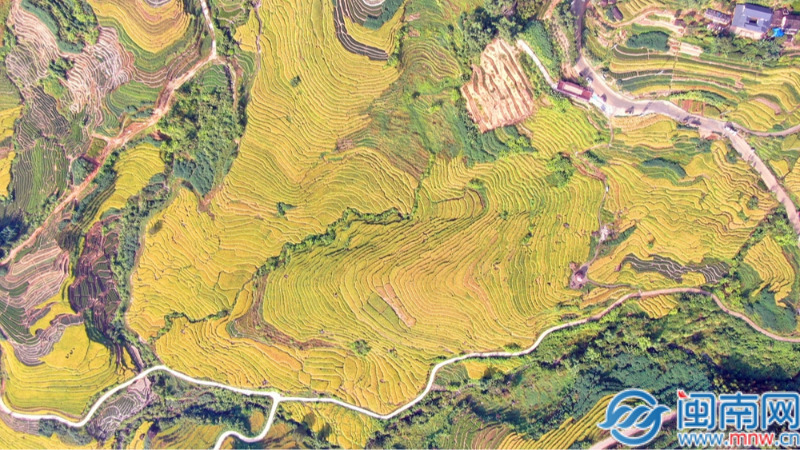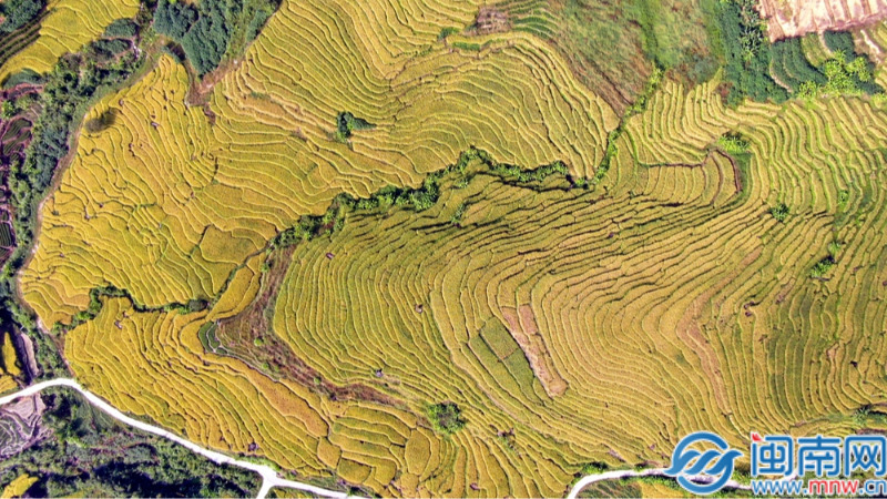 闽南网10月16日讯(通讯员 林国桦 唐小玲 闽南网记者 柯嘉进 文/图)眼下,华安县湖林乡石井村的千亩梯田里,稻谷迎来成熟期,层叠的曲线宛如大自然精心镌刻的“大地指纹”,漫山遍野的金色稻浪随风起伏,在深秋的阳光下熠熠生辉,展现出一幅壮美的丰收画卷。