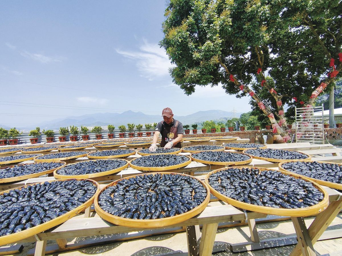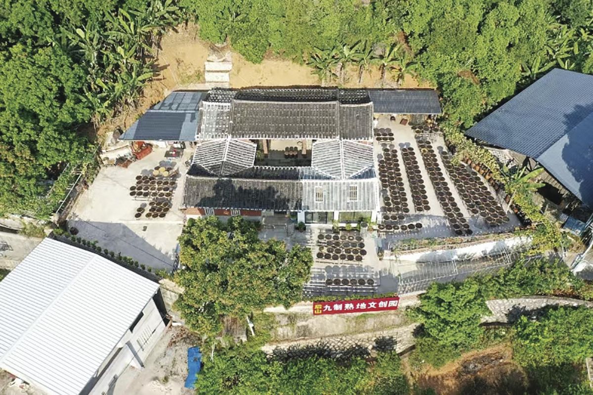 后山九制熟地文创园位于凤城镇上山村贡尾44号,文创园是由一座闽南古厝改造而成。走进园内,可见侧院中整齐支起一排排小竹匾,上面晾晒的熟地在阳光照射下,一颗颗油润光泽,黑如赤金。