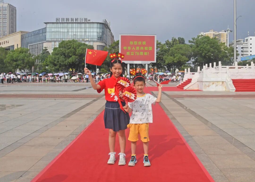 七十六载砥砺奋进,七十六载春华秋实。锦绣广场上国旗飘扬,“热烈庆祝中华人民共和国成立76周年”金色大字格外醒目。